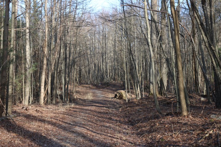 This is what has me driving on the Lincoln Highway into the mountain west of Gettysburg. I turn south at the remains of Thaddeus Stevens’s Caledonia Ironworks, which Confederate soldiers burned down in 1863 in retribution for his antislavery stance. Taking hairpin mountain roads, I track one run up only to follow another down. The paved thruway veers west down to the Borough of Mont Alto, but I turn east onto a gravel state-forest road. At the intersection the water utility has a chain link fence around sizable covered ponds collecting mountain spring water. The road heading up the mountain is desolate in January. My meandering climb roughly tracks a stream called Red Run. After several miles, I approach the ridgetop where I come upon a dirt maintenance road barred by a rusted gate. Without a key this is as far as the truck will take me.