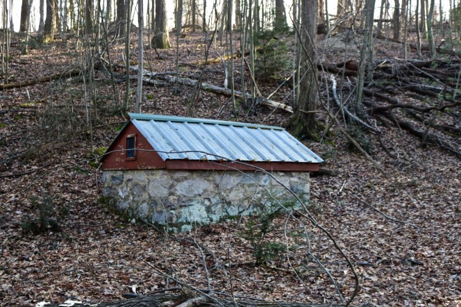 Tarburner Spring sits a couple hundred feet below a sandstone ridge. The west-facing slope levels into a shelf fifty feet across right where the spring emerges. In January, there is a single clear stream issuing from the earth, although abundant evidence indicates in wetter months this is a soggy field of springs. Even now there are wet puddles in the leaves where slow seeping occurs. With vernal melt and April rains, this terrace will become saturated, and the flow coming out of Tarburner will go from dependable pour to robust flush. Someone over the years, most likely from the Bureau of Forestry, built two small spring houses on the terrace.