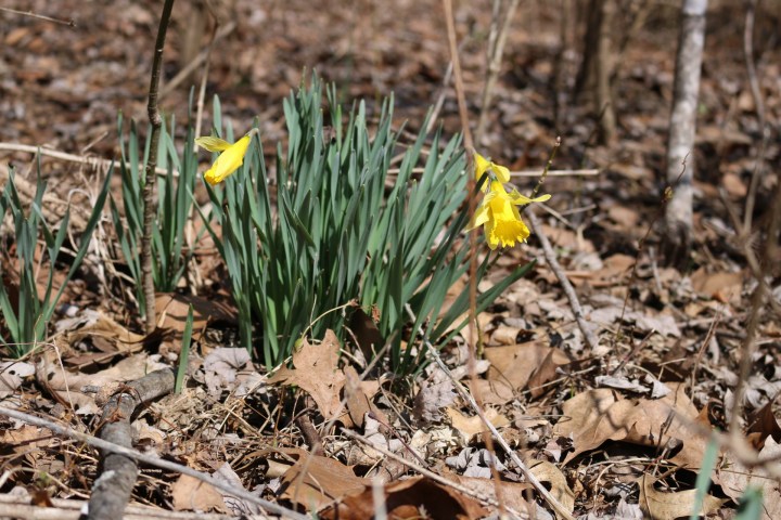 There is springtime evidence that people once lived here. Thick clumps of jonquils are blooming in the afternoon sun. They are untended in the woods, which had been someone’s front yard. Jonquils surviving abandonment is not news. They sprout every spring around foundation stones and long rotted fenceposts, where some industrious homeowner once put down roots. How they survived remediation is more curious, where roadside soils had been scraped and cooked in an incinerator. These bulbs grew along a park path that had been a gravel town road. Did they absorb the dioxin that was sprayed there for years? Are there traces of dioxin in these harbingers of spring? Have poison poppies gained an ally in dioxin daffodils? It makes me wonder what amount of soil remediation occurred to declare the former town to be clean enough for a park?