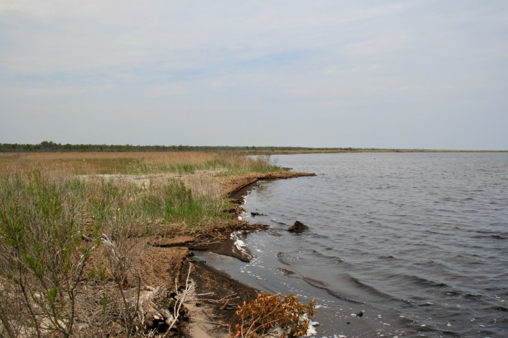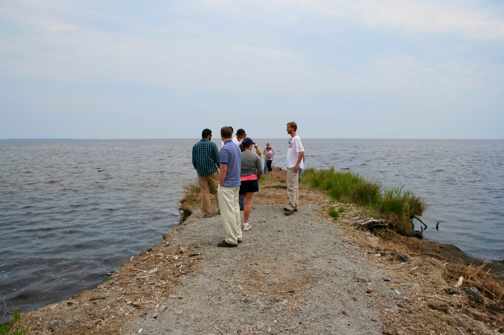 The ground on the Albemarle Peninsula is some mixture of sand and black organic soil. It is soft and unconsolidated. Whichever way the wind blows, one side of the peninsula is being eaten away by waves. No place is better to see this than at the end of Point Peter Road on the east side. Today the road ends as a decaying promontory jutting into the sound. Across seven miles of open water the Outer Banks are a thin barrier on the eastern horizon. There is a break where Oregon Inlet connects to the Atlantic Ocean. Everything from due north to due south is a broad expanse of shallow water sloshing about more from the push of the wind than the pull of the moon.