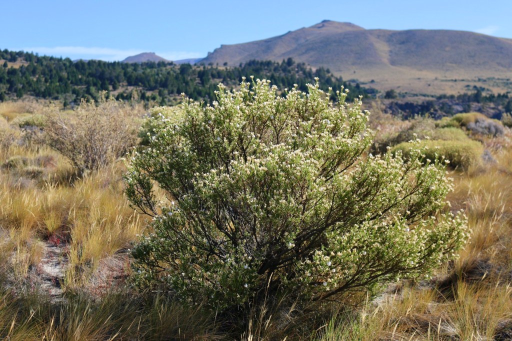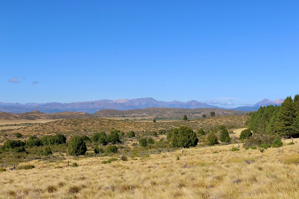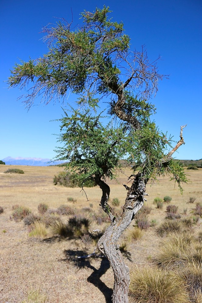 Leaving Bariloche and driving into the Patagonian steppe around the eastern end of the lake, the landscape quickly dries out. The topography is caught between the high Andes and the flat plains farther east. Forty minutes outside of town is the Estancia Fortín Chacabuco. This 13,000-acre (5260 ha) property has been managed by The Nature Conservancy since 2016 as a working ranch, demonstration site, and scientific research center. The ranch follows the Grassland Regeneration and Sustainability Standard (GRASS) and is home to several important faunal species including the tuco-tuco, a social rodent that lives only in areas of the steppe. Unfortunately, I don’t see a tuco-tuco or any animal life other than a few herding dogs. It is an open, windswept landscape of rolling hills and rocky knobs. The semiarid climate naturally supports grasslands punctuated with individual trees and clumping shrubs.