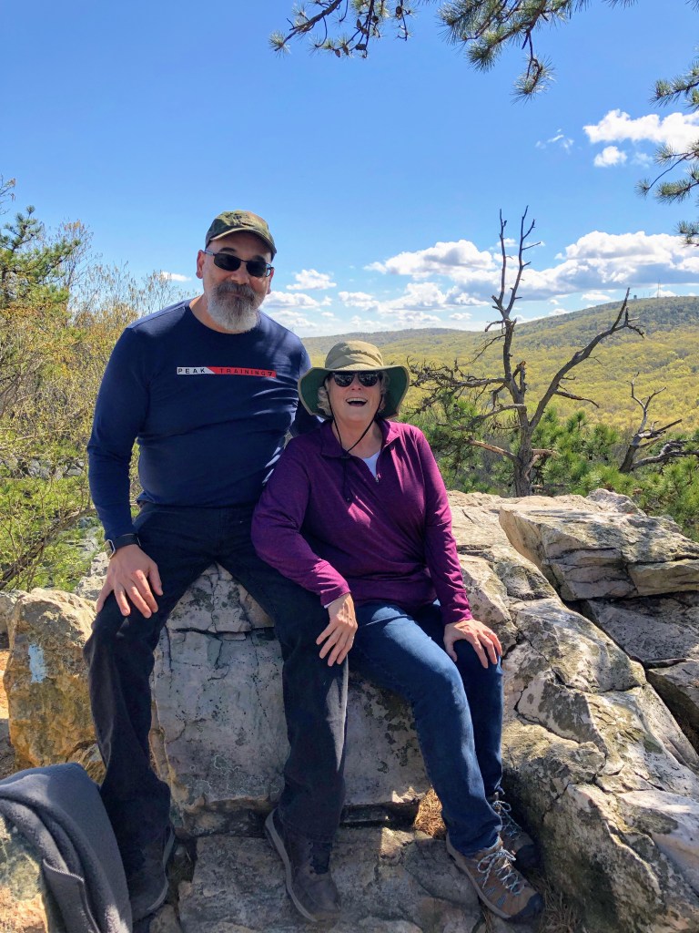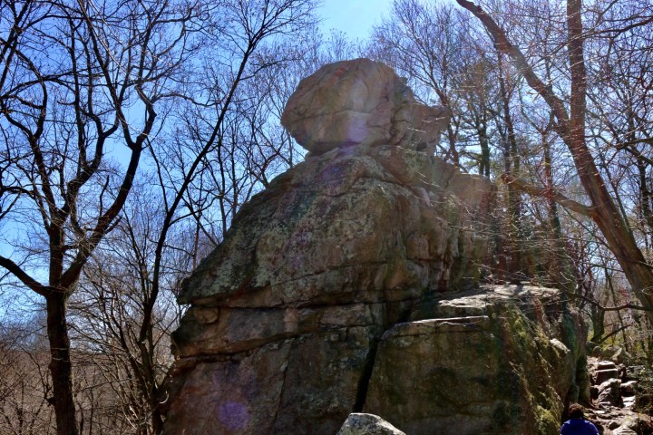 We are joined by a family speaking Spanish to themselves and English to us, out for an Easter parade. Two school-aged boys lift a gordo brown and white hound dog up the rock pile. After admiring the promontory, they pass through with daypacks of lunch heading for the Appalachian Trail.