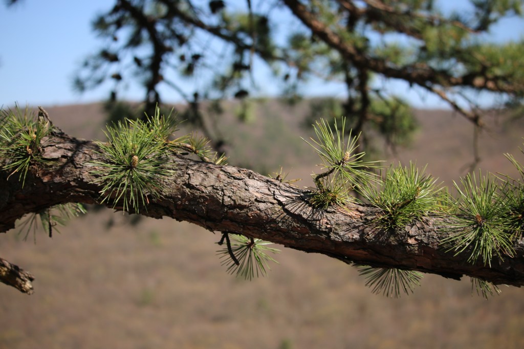 We reach the ridgetop where sandstone pokes through the thinning forest soil. The trees have fewer resources and are smaller in stature. The trail turns west and follows the ridgeline. We work our way over and around increasingly larger white sandstone formations until we get to the biggest pile. The rocks here, more exposed to the sun and wind, are the white weathered bones of the mountain. It takes some scrambling but we get on top of White Rocks. It is bare rock here, the only trees are a few stunted pines that have wedged a toehold in fissures. Pine needles litter about but they will blow away before they become soil. We can see south across the hollow to the next ridge. The view is lovely for its intimacy From above we see the oaks are flowering, giving a chartreuse tinge to the woods. To the north we have windows of long views across the agricultural valleys that have given the landscape its modern form.