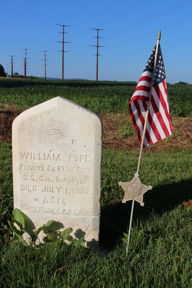 I wonder about the stories of the people buried here and their connection to this landscape. I see the grave of William Pope who died in 1902 at the age of 72. He lies in a black walnut grove surrounded by a 19th century farm. A 21st century power line slices through the farm. In the long view, the silhouette of South Mountain shapes the horizon. Where was Private Pope of Company B, 32nd Regiment born? Where did he live? Were his liberty and the fruits of his labor entitled to another person for the first 30 years of his life? Where did he serve fighting for the United States of America? And especially, when did he come to this landscape? Was the rolling farmland to his liking? Did he like the coolness of spring nights in this valley? Were the townsfolk welcoming or hostile, or something else altogether? Do his descendants visit him here?