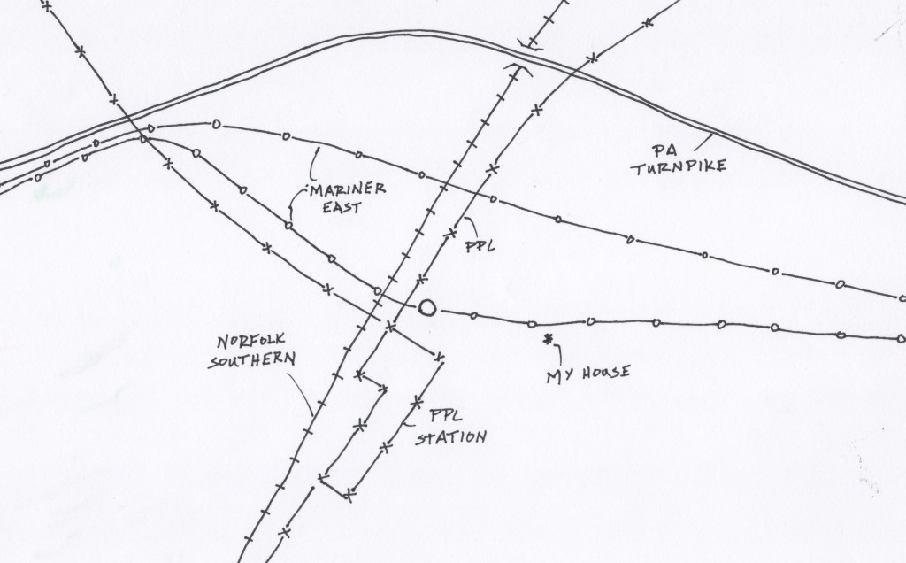 But the old pipe isn’t nearly big enough, so another 8-inch pipeline, Mariner East 2, has been under construction for four years. That will still not big enough, so a parallel 16-inch pipeline, Mariner East 2x, is also being built. When we moved in three years ago the work was going on in our front yard and proceeded for another 18 months. When completed end-to-end these pipelines will carry more than a half a million barrels a day of butane, propane, pentane, and ethane. The petrochemical river from the Inland Empire to industries and ports on the Delaware River flows thirty yards from where I lay my head every night..
